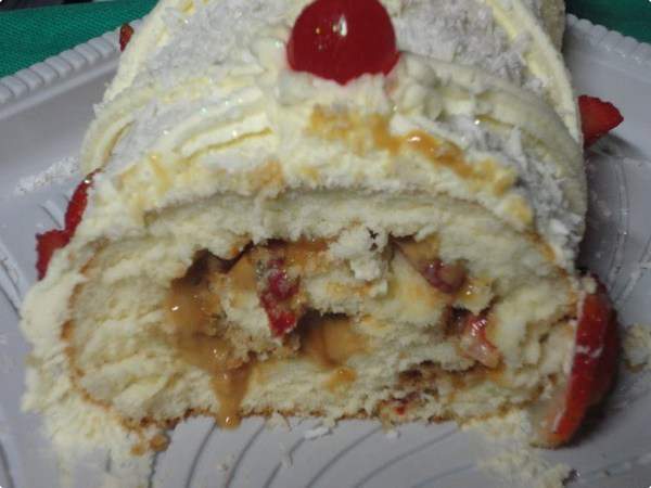 Depois de assado, deixe esfriar, retirando ele da forma, sem enrolar. Passe o doce de leite por toda a massa. Corte os morangos em pedaços pequenos e espalhe pedacinhos por toda a massa.