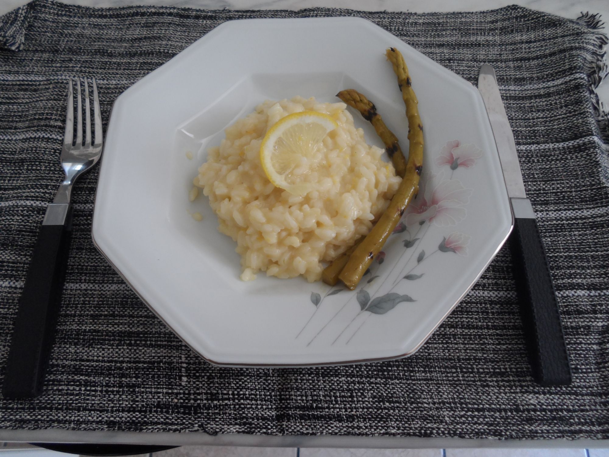Mantenha o caldo aquecido em uma panela. Em fogo médio, derreta 2 colheres (chá) da manteiga e refogue a cebola até ficar brilhante. Adicione o arroz e frite. Aumente o fogo na potência máxima e adicione o vinho branco. Mexa sem parar até evaporar. Coloque uma concha de caldo e misture bem até evaporar. Adicione mais uma concha de caldo e mexa sem parar até evaporar. Adicione metade do suco de limão siciliano e continue mexendo. Repita essa operação até que o risoto fique “al dente”, lembrando que ainda ele irá cozinhar por mais alguns minutos. Adicione uma última concha de caldo e desligue o fogo. Junte o queijo parmesão ralado e o restante da manteiga gelada. Acerte o sal. Adicione as raspas de limão e o restante do suco. Deixe o risoto descansar por 4 minutos antes de servir.
