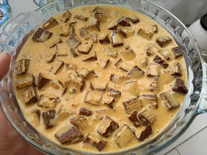 Depois de frio.Coloque em uma tigela o doce de leite (leite condensado cozido),o creme de leite e o chocolate Bis picado.