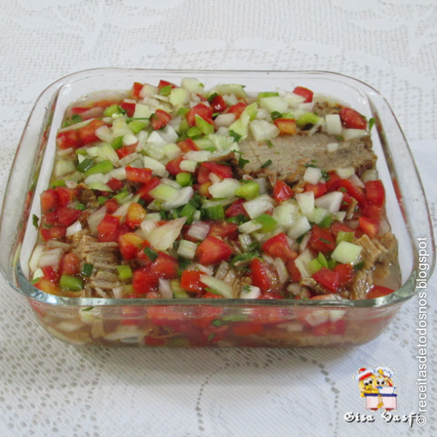 Prepare o vinagrete e monte as camadas em um pirex, alternando vinagrete e camadas de carne.
