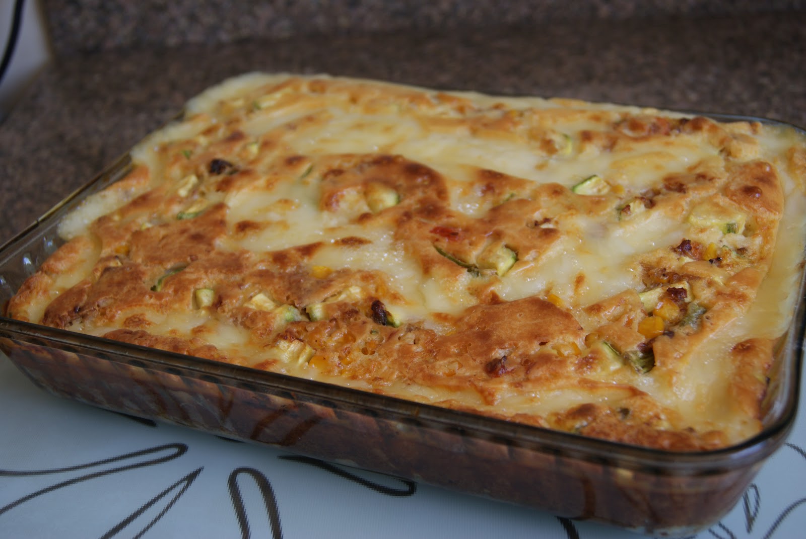 Despeje metade da massa numa forma refratária e untada e coloque o recheio sobre ela.