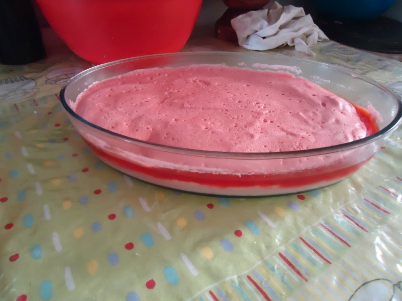 Dissolva a gelatina em 1 xicara (chá) de água fervente, junte 1/2 xícara (chá) de água fria e reserve. Bata as claras em neve, junte o restante do açucar e acrescente a gelatina reservada, misturando delicadamente.