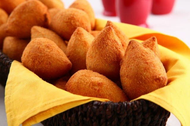 Abra a massa com as mãos, coloque uma azeitona no centro e o recheio, feche dando formato de coxinha