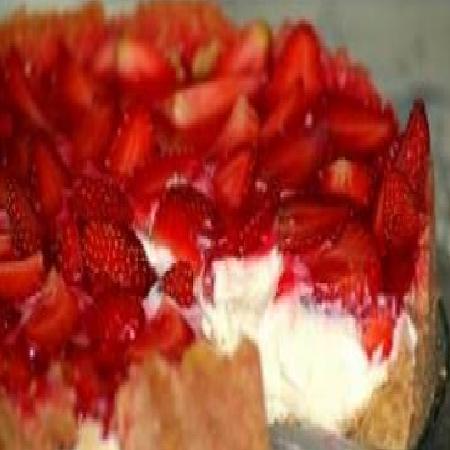 Já nesse ponto coloque a gelatina aos poucos em cima da torta deixando os morangos por completo cobertos com a gelatina, coloque novamente para gelar