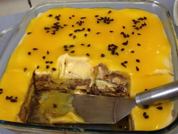 Espalhe sementes de maracujá por cima e coloque para gelar coberto com papel alumínio para não ressecar.