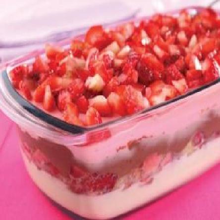 Em uma travessa despeje o creme branco no fundo e por cima o creme com chocolate, decore com morangos como preferir