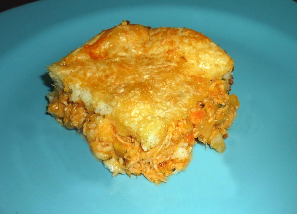 Coloque em cima da massa crua, logo após o queijo cortado em cubinhos. Bata as claras e depois as gemas. Acrescente o creme de leite e tempere com o sal, coloque uma pitada de fermento e cubra o frango e o queijo com essa mistura e leve ao forno médio para assar por cerca de 40 minutos