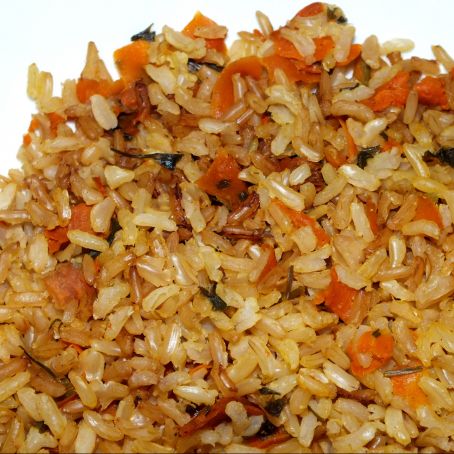 Derreta a margarina numa panela, coloque o arroz e refogue um pouco, adicione a água quente, a cebola e o o sal á gosto. Tampe a panela e cozinhe, quando estiver quase seca a água coloque a cenoura e deixe cozinhar mais um pouco até secar. Após secar a água coloque o tomate,a salsinha e a cebolinha, desligue o fogo e deixe tampado descansando por 5 minutos. Sirva.
