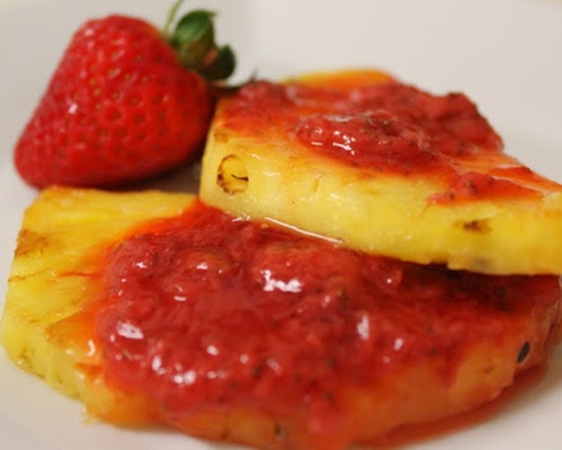 Coe em peneira. Coloque a calda sobre o abacaxi e enfeite com as uvas cortadas ao meio.