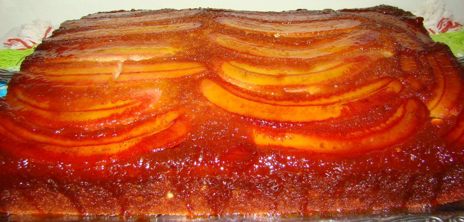 Caramelize uma xícara de açúcar em uma forma, fatie 4 ou 5 bananas e coloque no açúcar já caramelizado, se preferir deixe a mistura ferver um pouco com as bananas. Retire a mistura do forno e aplique as bananas sobre o bolo. A receite de bolo fica de dar água na boca.