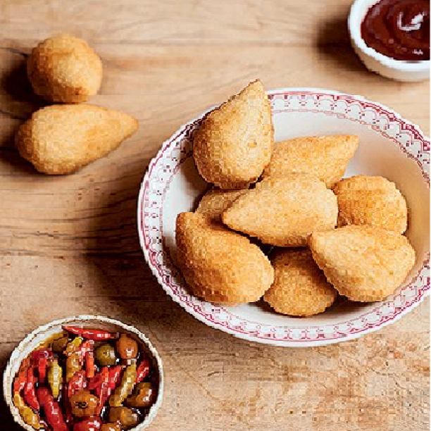 Modele as coxinhas, empane na farinha de rosca com a mistura de água e farinha de trigo e frite em óleo quente.