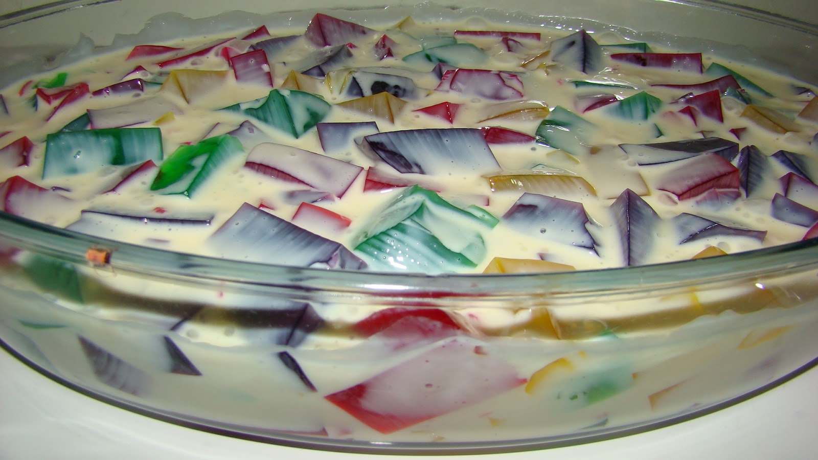 prepare as 4 caixas de gelatinas separadas de acordo com as instruções das embalagens, corte em quadrinhos e reserve, bater no liquidificador o leite condensado o creme de leite e a gelatina sabor morando dissolvida em 1 copo de agua fria e 1 copo de agua quente,por aproximadamente 5 min. misturar este creme em cima da gelatina colorida,mexer e levar para gelar novamente.