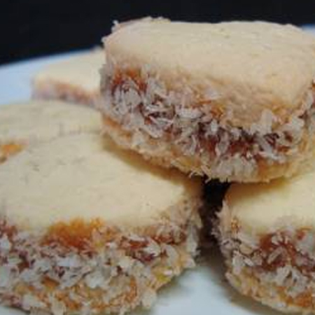 Una dois biscoitos com doce de leite e passe coco ralado em volta