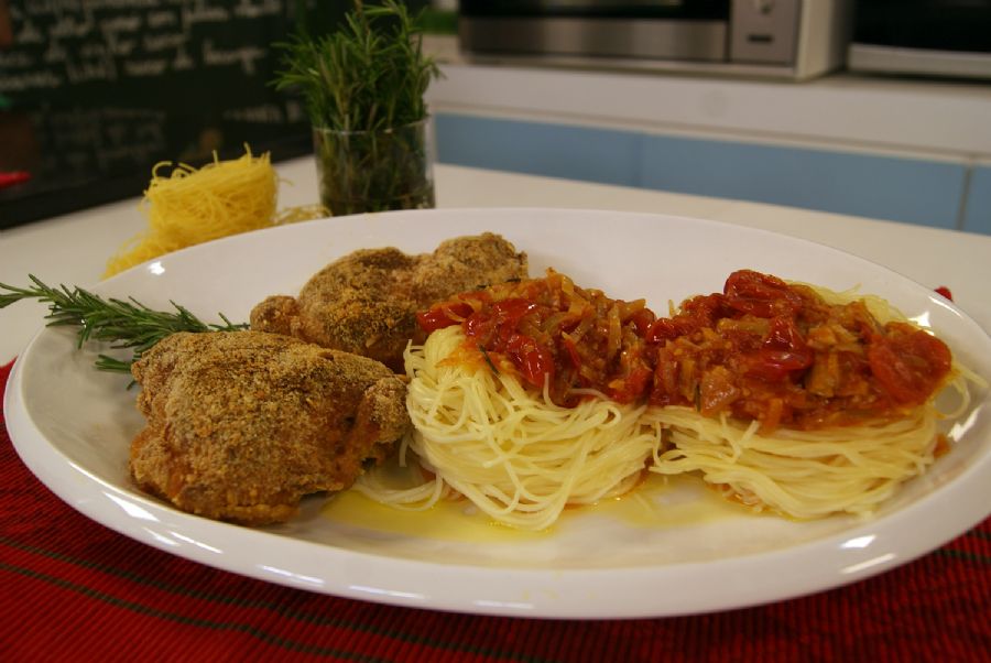 Sobrecoxa de Parmesão no Ninho de Macarrão