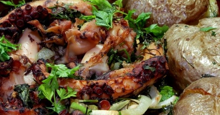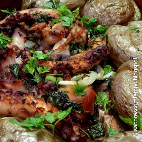 Num tabuleiro de barro, disponha o polvo cortado aos pedaços, ladeie-o com as batatas a murro e cubra com a cebola em meias luas, os dentes de alho laminados e a salsa picada. Tempere com sal e pimenta, regue generosamente com azeite e leve ao forno por, aproximadamente, 25 minutos. Retire do forno, decore com salsa picada e sirva imediatamente, acompanhado com uma salada de alface, cebola e rúcula.