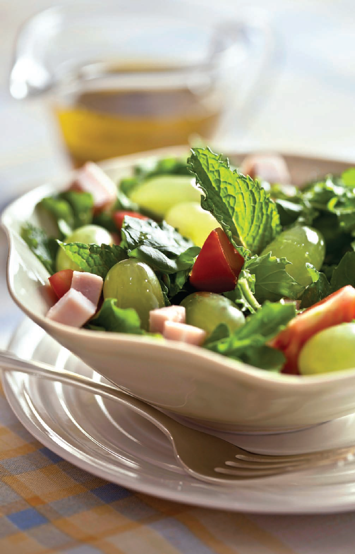 3. Em uma saladeira grande, misture a rúcula e a hortelã, e disponha a uva, o tomate e o “blanquet” de peru;