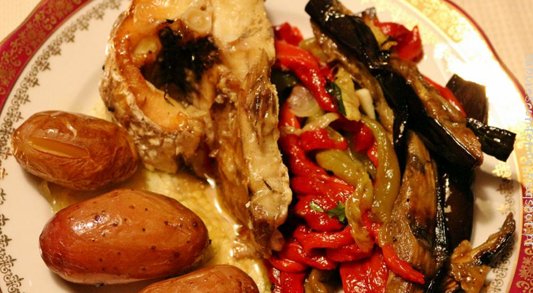Depois de escorrer as batatas coloque-as no tabuleiro ao lado do peixe, regue tudo com um fio de azeite e leve ao forno a 200°C, durante aproximadamente 2 horas. Durante a cozedura vá regando o peixe com o suco libertado.