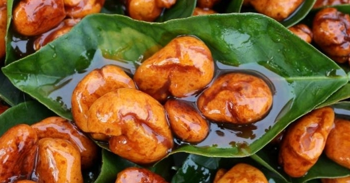 Num tacho junte o mel e deixe levantar fervura. Frite os pequenos bocados de massa no mel e disponha-os nas folhas de laranjeira.