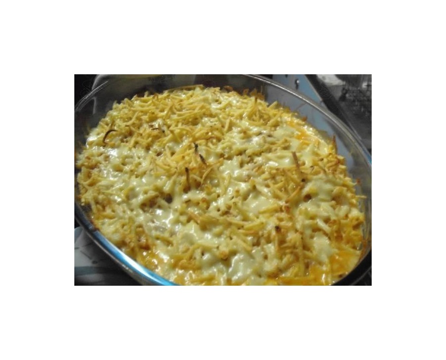 Tire do forno, acrescente a batata palha e o queijo picado e deixe por mais 5 minutos no forno.