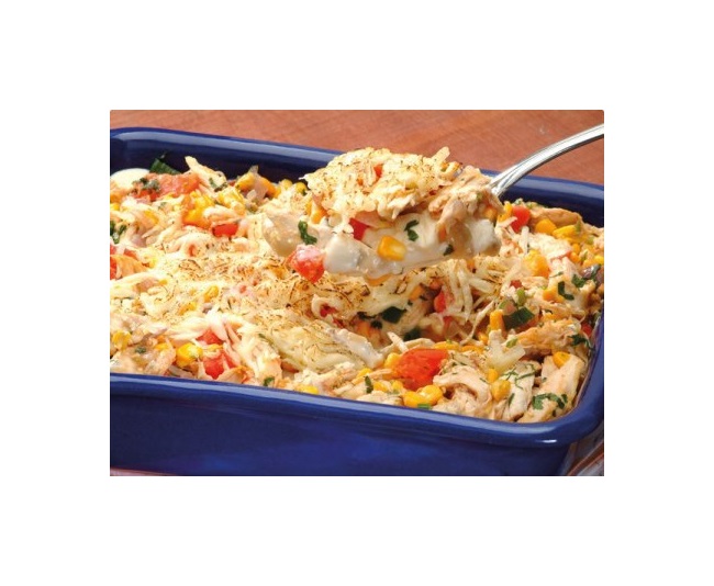 Frite a cebola no óleo até ficar transparente. Junte o milho verde e o frango desfiado. Tempere com sal e pimenta a gosto.