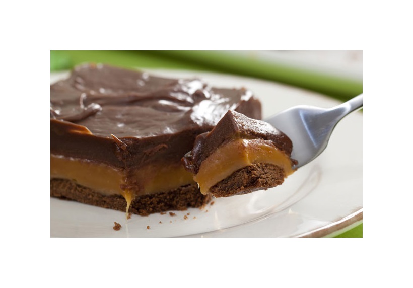 7. Prepare a cobertura: derreta o chocolate em banho-maria ou no micro-ondas, misture o creme de leite e distribua sobre a camada de caramelo.