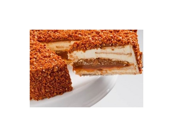 Desenforme em uma bandeja redonda, cubra com doce de leite e salpique por cima o crocante.