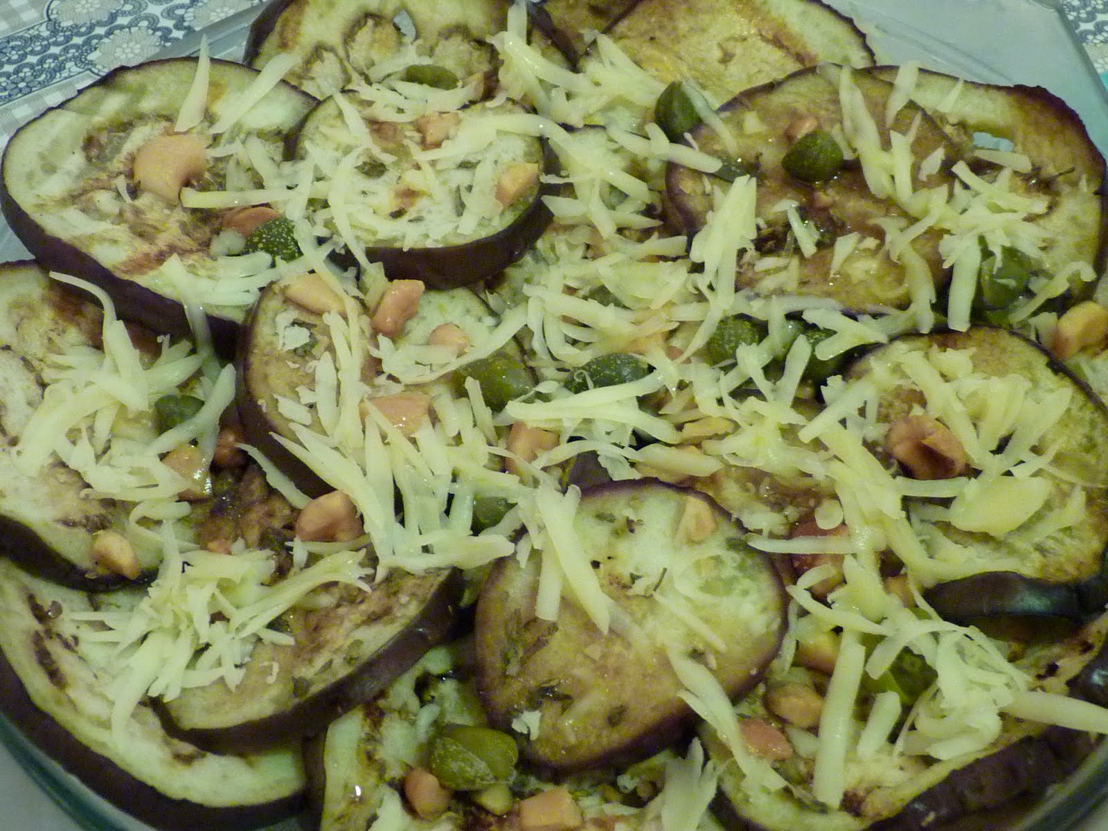 Frite as beringelas em fatias no azeite de oliva extra virgem,antes de fritar coloca um pouco de sal e deixa por 15 min.depois frita.Monte no pirex as fatias fritas e os temperos,coloca bastante vinagre e azeite que fique bastante molhado.Coloca na geladeira.Apronte para comer de um dia p outro.