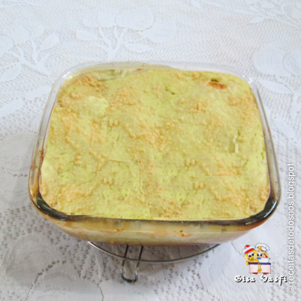 Cubra tudo com as fatias de queijo prato e o restante da massa.