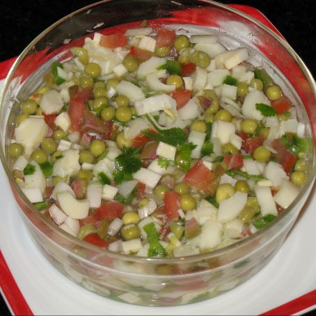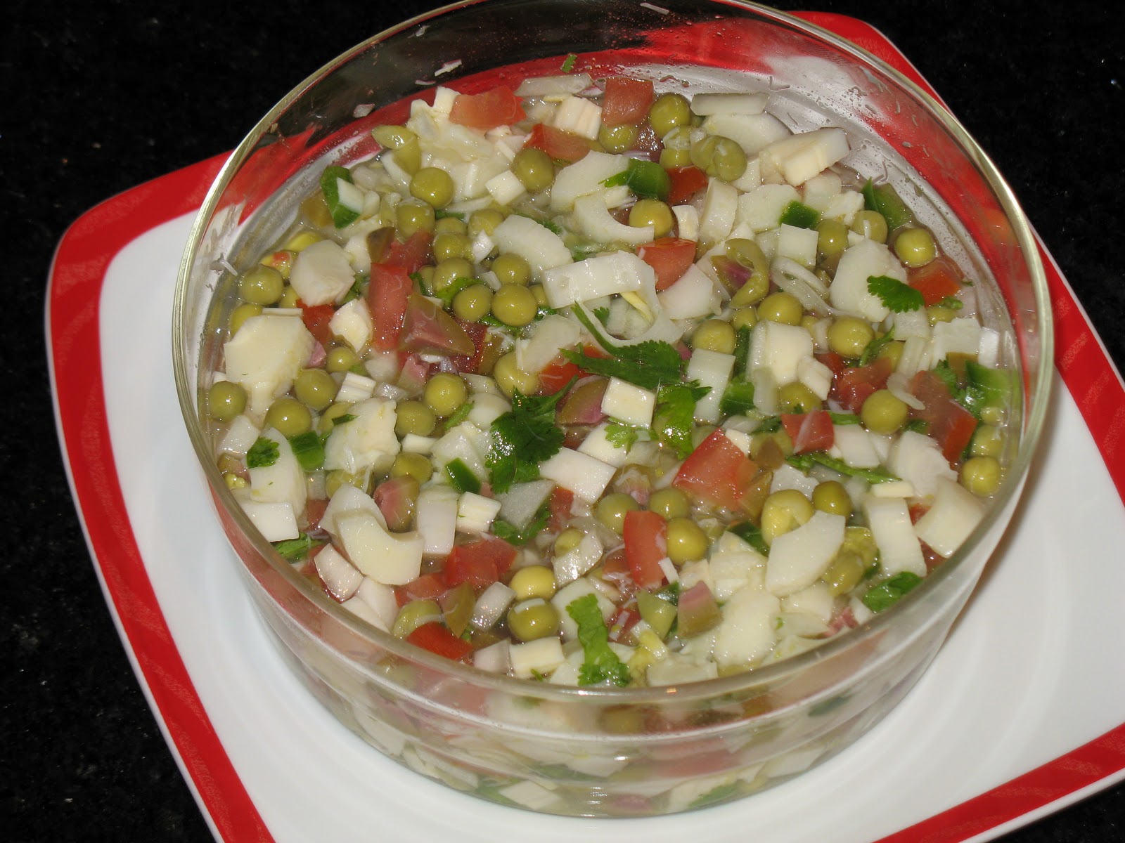 Faça um vinagrete com o tomate, a cebola, o vinagre, a salsa e o óleo.