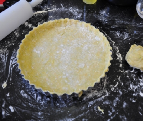 Abra a massa e coloque em uma forma redonda de fundo removível.