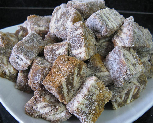 Deixe esfriar e corte em quadradinhos. Passe-os no açúcar.