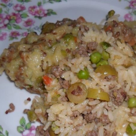 Em uma panela, aqueça o azeite e refogue a cebola e o alho. Acrescente a carne moída e doure-a. Na sequência, coloque o caldo de carne, o molho de tomate, misture e deixe apurar por aproximadamente 10 minutos. Junte o milho, a ervilha e misture. Acerte o sal e reserve. Em um refratário untado com azeite de oliva, coloque uma camada de arroz, cubra com uma camada de carne e outra de mussarela. Em seguida, coloque outra camada de arroz, camada de carne e salpique o parmesão. Leve ao forno alto para gratinar e sirva.
