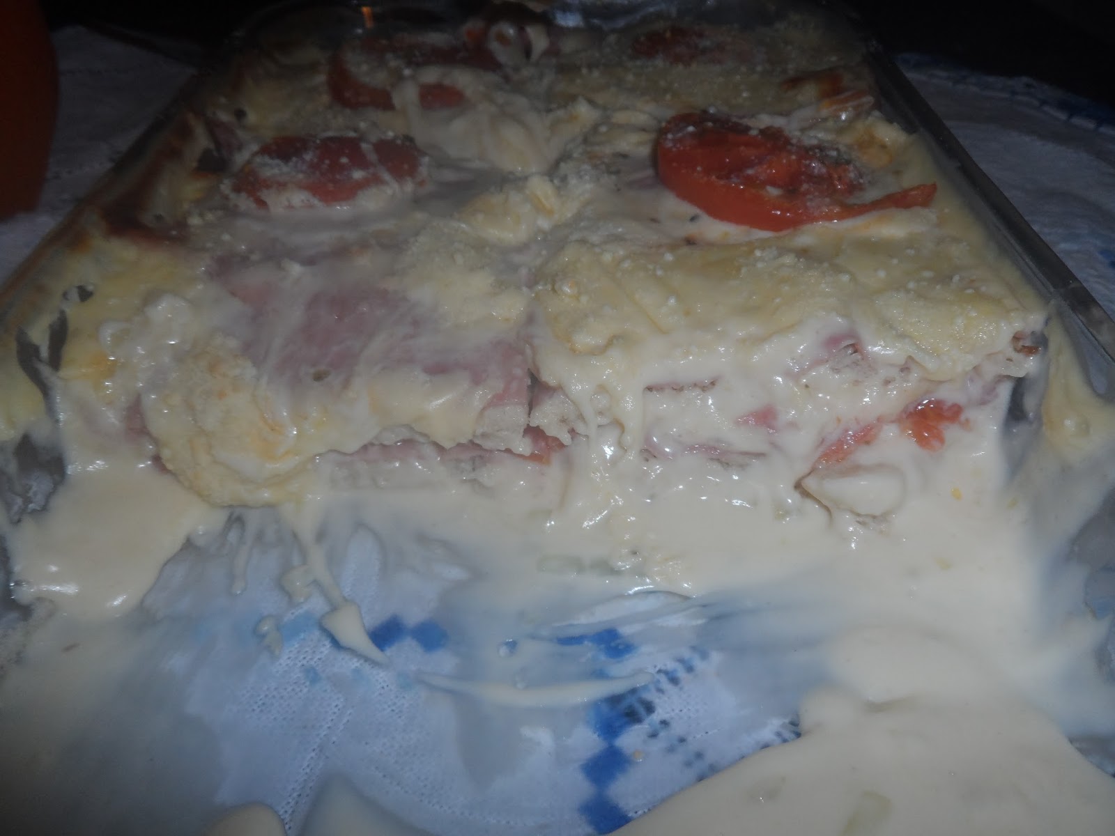 E mais uma camada de presunto, mussarela, tomate e orégano