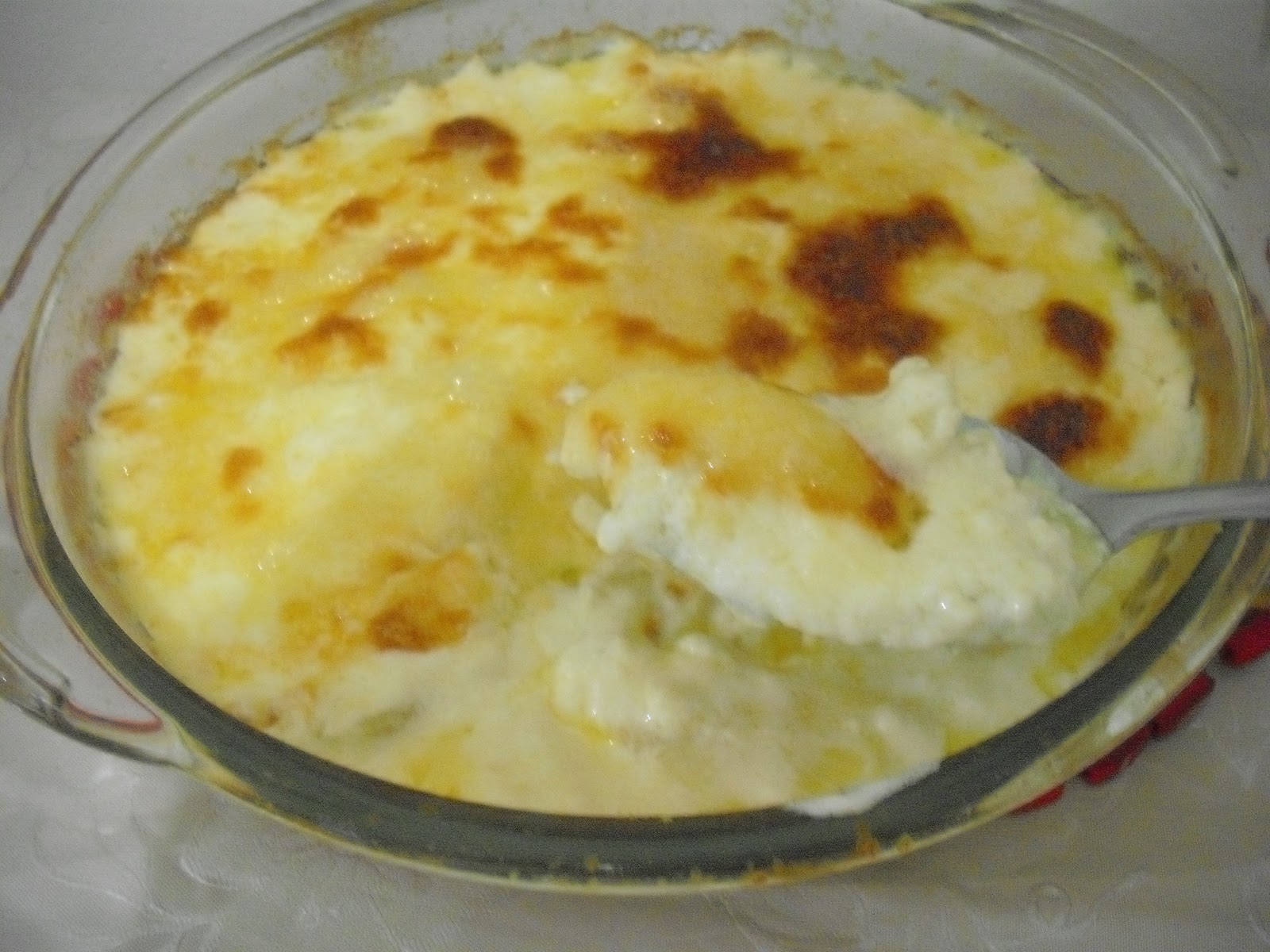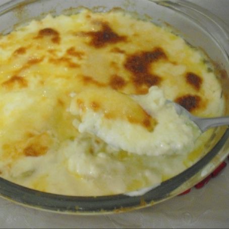 Com uma escumadeira, retire as batatas e disponha- as em um refratário untado com manteiga. Reserve o caldo da panela.