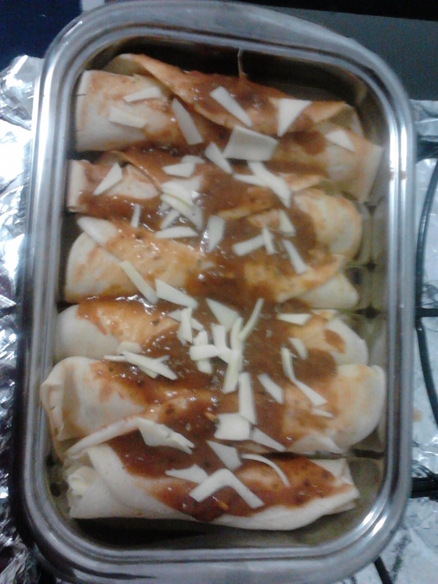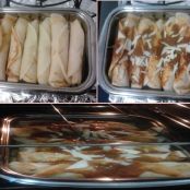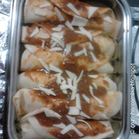 Assim coloque as panquecas enroladas numa travessa, despeje um molho de salada por cima das panquecas e um pouco de mussarela ralada. Coloque no forno pré-aquecido a 180°, deixe mais ou menos uns 5mim que é o tempo necessário para que a mussarela derreta.