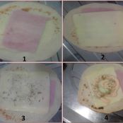 Como gosto de muito queijo sempre coloco mais mussarela do que presunto, mas fica a preferencia de cada pessoa. Vou mostrar duas maneiras de montar esta panqueca.