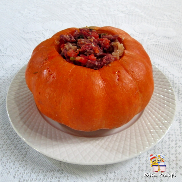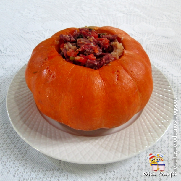 Espalhe o requeijão no fundo da abóbora e acrescente o refogado de carne seca.