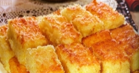 Retirar a parte dura do centro da mandioca e bater no liquidificador com os demais ingredientes, menos o coco ralado.