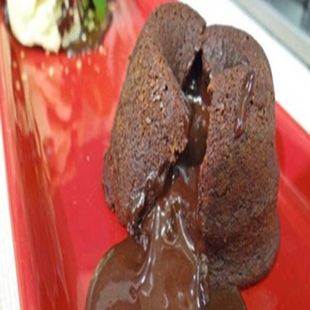 Transfira a massa (feita acima) para forminhas para empadinhas, untadas com manteiga e polvilhadas com chocolate em pó e leve ao forno alto pré-aquecido a 200°C por 11 minutos. Retire do forno e sirva em seguida com calda de chocolate.