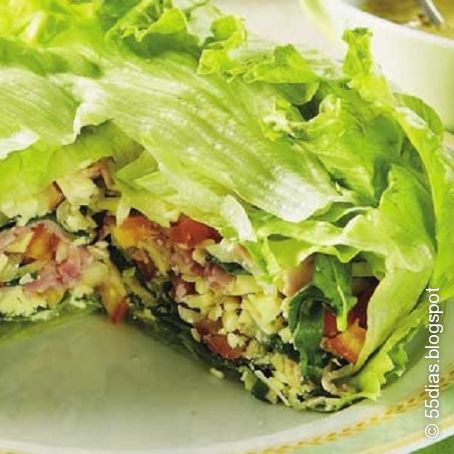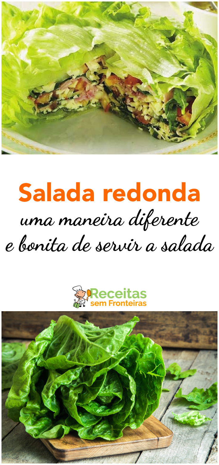 Com as folhas de alface, forre o fundo e as laterais de uma forma redonda de aro removível. Reserve algumas folhas para cobrir a salada.
