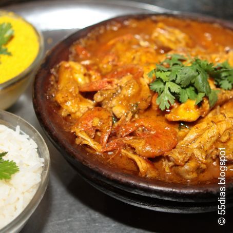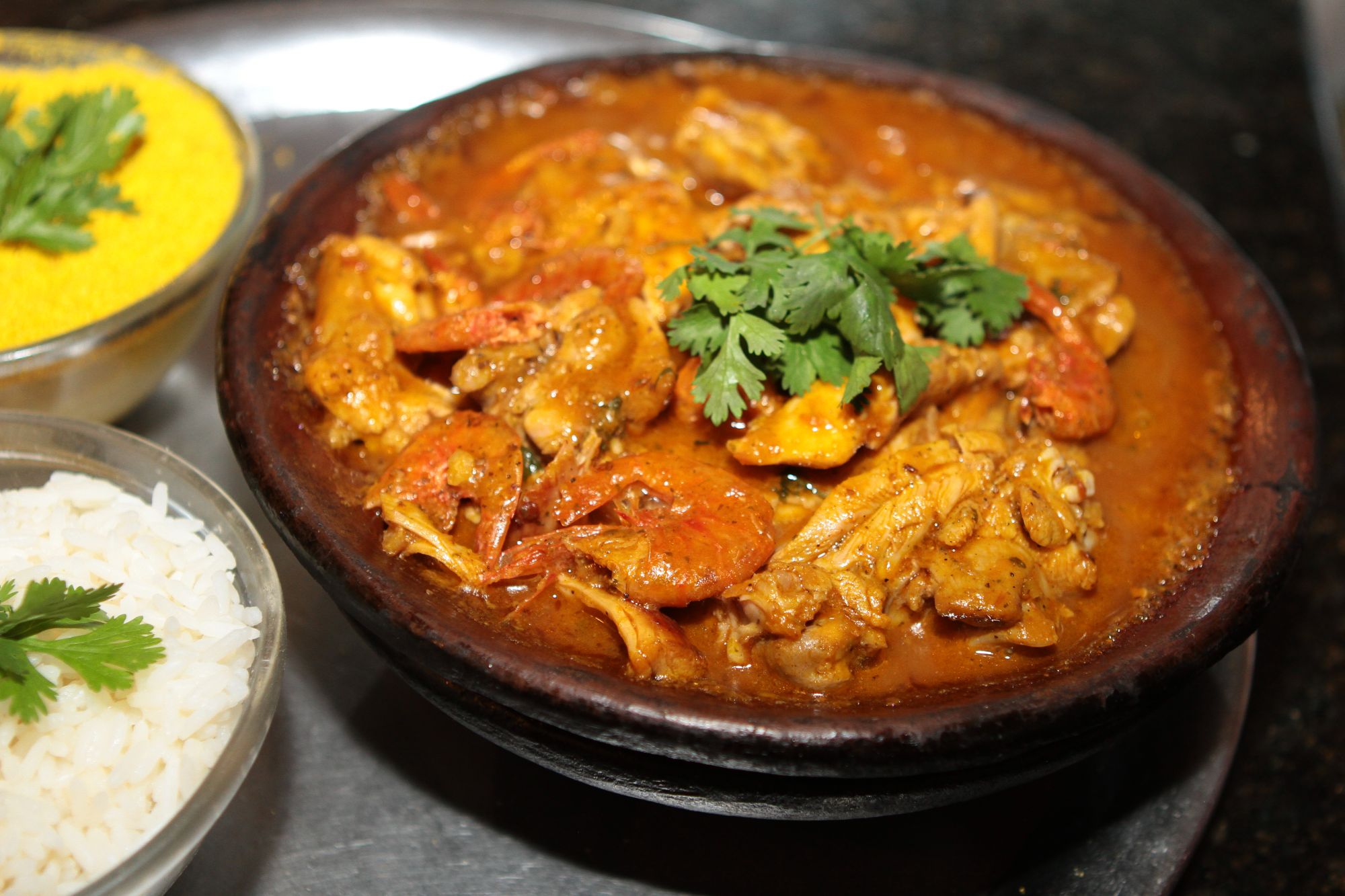 Na panela de barro colocar os tomates picados grosseiramente, a cebola picada grosseiramente, os pimentões, o gengibre, a castanha de caju triturada, o amendoim, o camarão seco triturado (reservando alguns inteiros para no final decorar o prato), colocar a pimenta dedo de moça picada, adicionar o frango, o leite de coco, o coentro, adicionar um pouco de água levar ao fogo e tampar deixando ferver para pegar bem o gosto dos ingredientes.