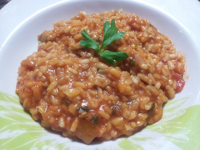 Coloque o arroz, refogue um pouco, vá adicionando o caldo quente, aos poucos, deixe absorver e coloque mais, até o ponto de estar cremoso e al dente