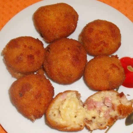 Com as mãos, pegue pequenas porções da massa e faça bolinhas. Passe-as em na mistura de ovo com leite e em seguida na farinha de rosca (faça este processo 2 vezes). Numa panela, com óleo quente, frite as bolinhas até dourar. Escorra em papel absorvente e sirva em seguida.