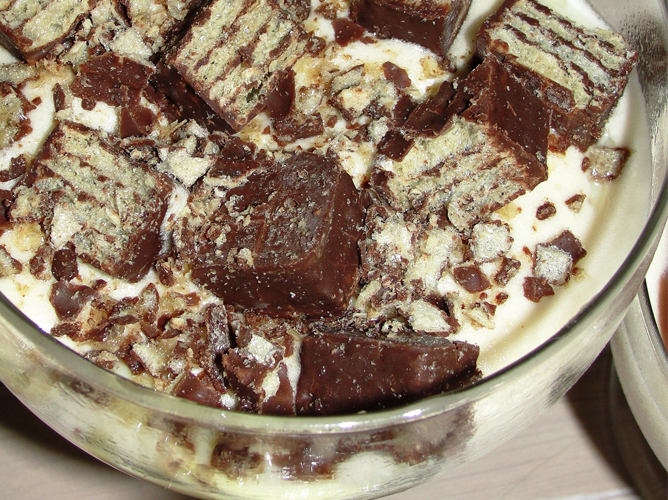 Em taças individuais ou em um refratário, coloque o chocolate bis picado e cubra com o leite condensado.