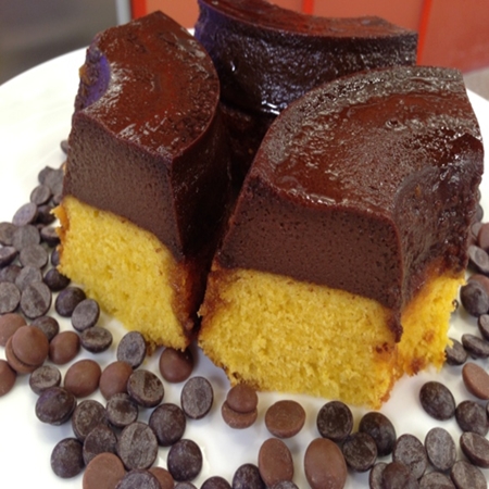 Montagem: na forma de pudim já caramelada, coloque a massa do bolo e em seguida, com delicadeza, coloque a massa do pudim e leve ao forno médio em banho maria. Asse por aproximadamente 50 minutos.