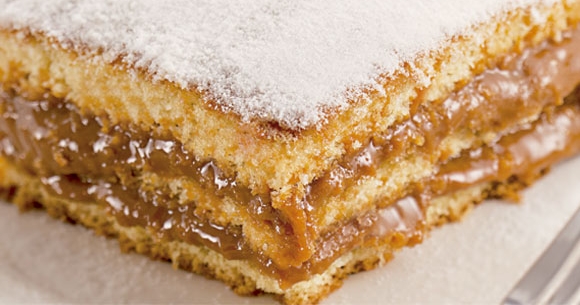 Montagem: cubra uma das metades da massa com parte da calda e espalhe o doce de leite. Em seguida, adicione a outra metade da massa, o restante da calda e, para finalizar, polvilhe com açúcar de confeiteiro.