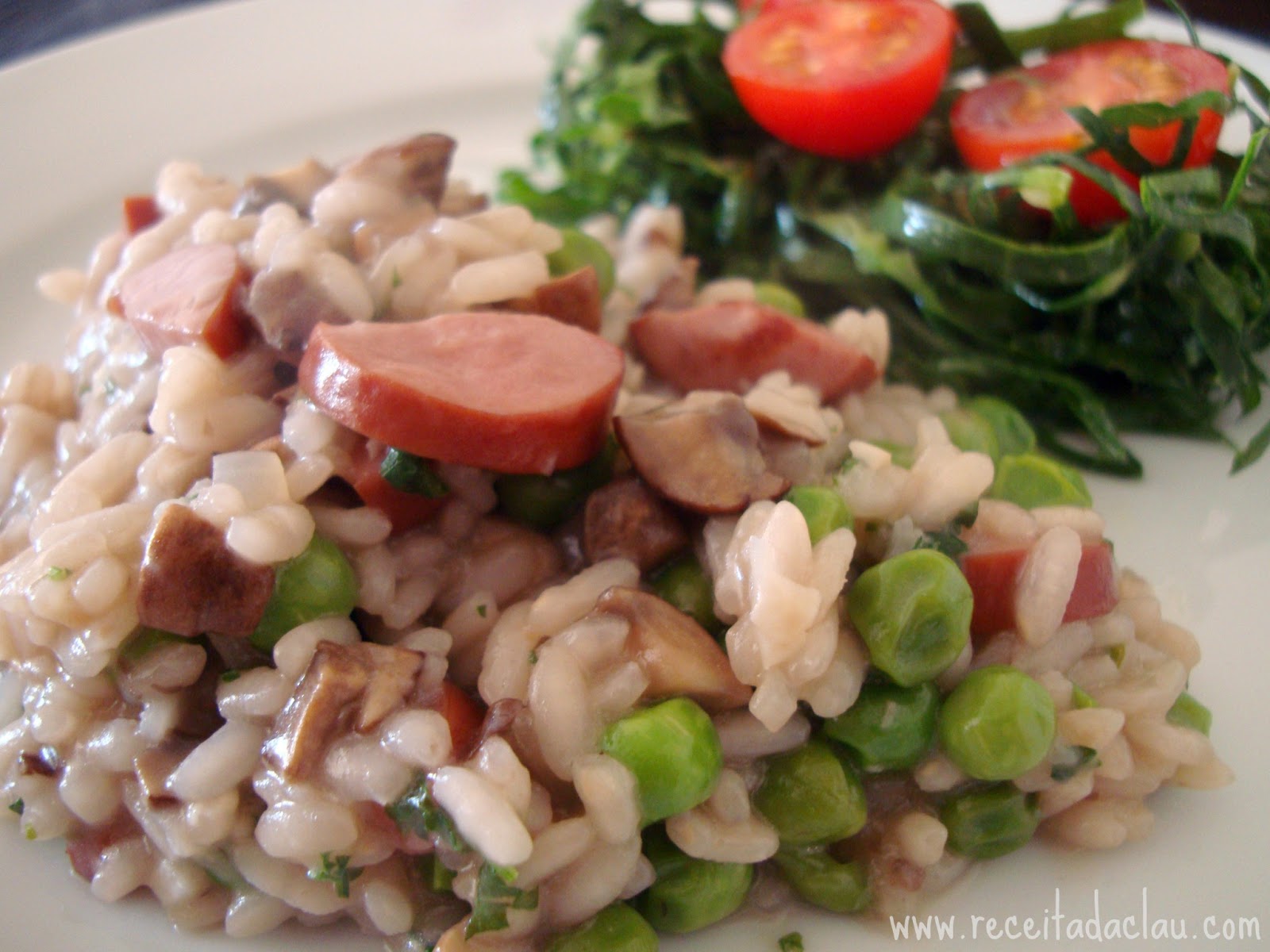 Corte as salsichas em pedaços de 1 cm e adicione ao risoto com as ervilhas; tempere com sal. Mexa a mistura sobre fogo baixo por cerca de 3 minutos.