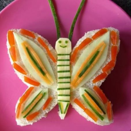 Para montar o sanduíche corte o centro de uma das fatias de pão com uma forminha de borboleta ou de outro desenho. Passe o patê na outra fatia de pão e feche o sanduíche.
