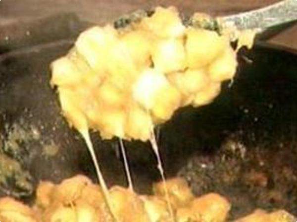 Quando a banana já está se desfazendo, junto o queijo picado. Por último, coloque a farinha.