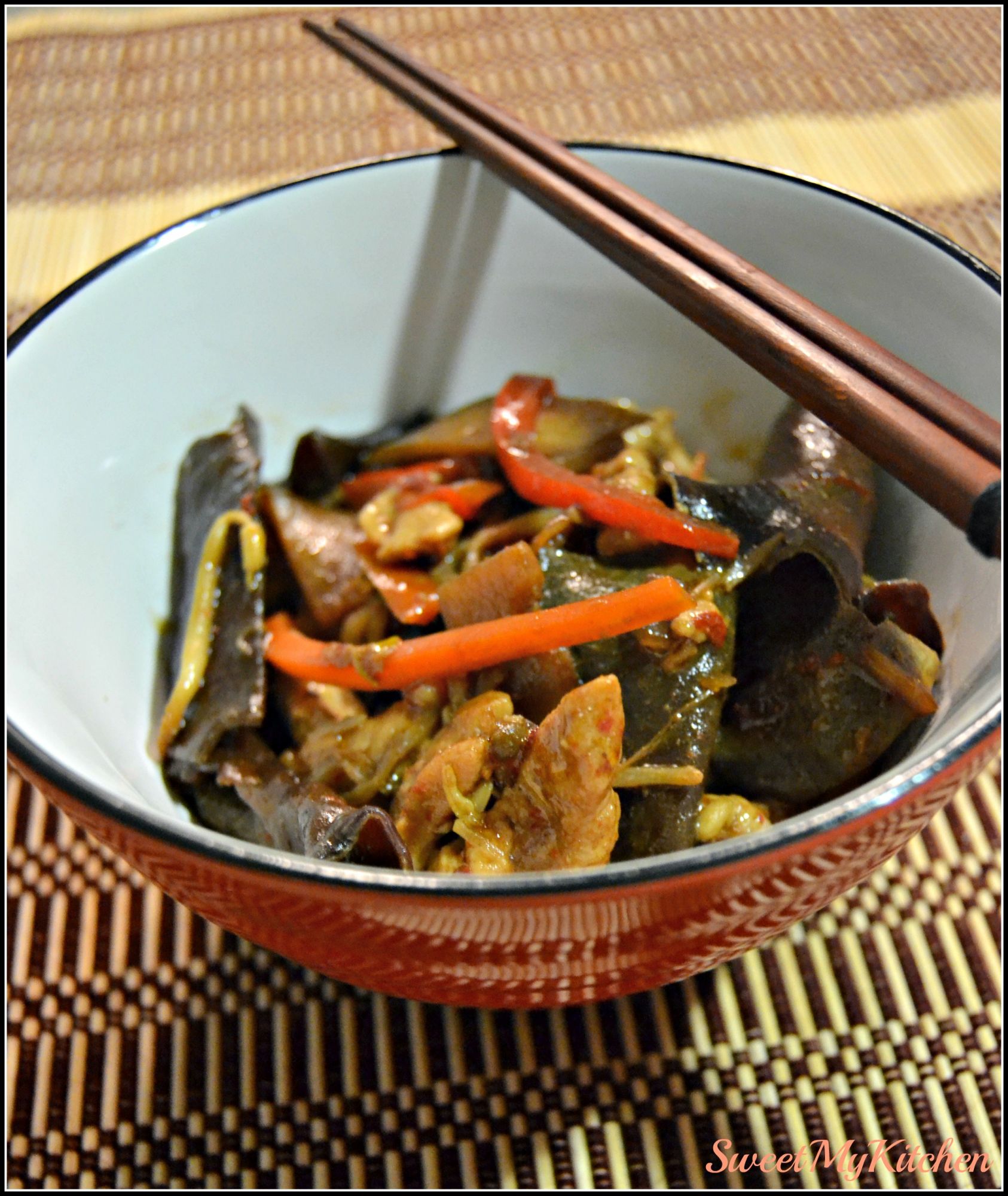 - Junte as chalotas, o pimento, as cenouras, os cogumelos e os flocos de malagueta. Frite tudo, mexendo sempre.
